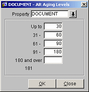Select Configuration > AR > Aging Levels to set the AR aging levels for your property. OPERA allows you to define the aging periods most suited to your operation. In these fields you define the ending number of days and OPERA calculates the beginning number. For example, if you enter 30 in the first field, aging period one (current) is 0 - 30 days. OPERA calculates that aging period two begins at day 31 and asks you to supply the end day for that period (e.g., 60). OPERA calculates the beginning of aging period three as day 61 and asks for the end of this aging period; and so on. This pattern continues until you have filled out all five fields. The last field is automatically calculated as everything over the last number you entered.