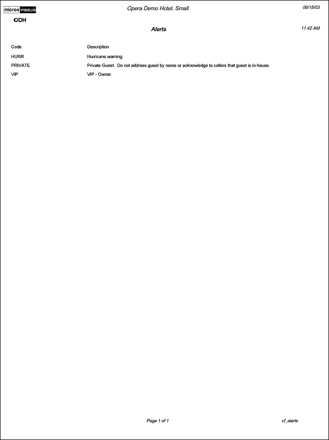 The Configuration report for Alerts will display all Alert types that have been configured for your property. The ALERTS function must be active to use this functionality. Alerts are attached to reservations to display based on the Area selection of either at Check In, Check Out or when a Reservation is created.