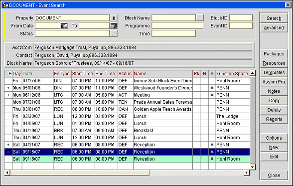 All events must be attached to a business block. If the event is created using the New button on the Event Search screen, you will be prompted to identify the business block to which the event will be attached. To choose the business block to which the event will be attached, use the Business Block Search screen.
