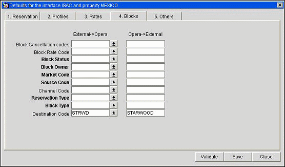 This default page is the block default page. The OPERA values can be chosen by selecting the button seen alongside the text entry field. A list of configured and valid OPERA values for this item displays. The external system values have to be inserted in a free-format style, but need to be valid for the external system to accept the record. Be aware of case sensitivity.
