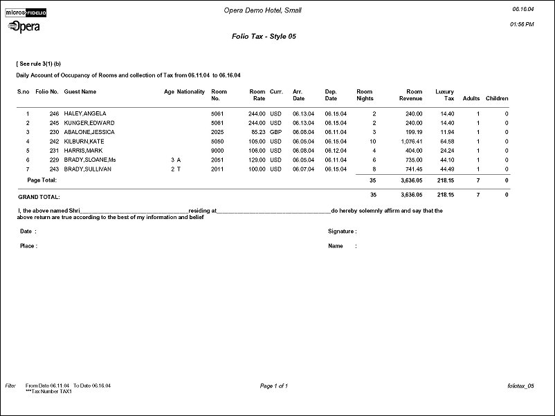 The will display the breakdown of Luxury Tax that were used on each reservation for a specified date range.