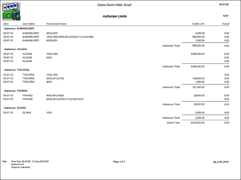 The report displays all Authorizers for the selected date and the corresponding Credit Limits that have been granted for Groups of Transaction Codes. Additionally, the report displays the Actual Comp Charges that were posted by that Authorizer for each Group of Transaction Codes.