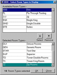 Select/Remove. Select additional room types or remove already selected room types. The Ctrl-PgUp and Ctrl-PgDn keys point you to the grids and the Enter key actually does the selecting and/or removing of room types in this option.