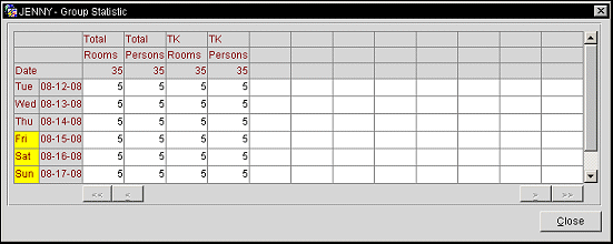 Date (1st column). Dates of the group reservation. The date column starts with the first arrival date for the group. Days of the week with a yellow background represent a weekend day as configured in the General>Weekend Days application setting.