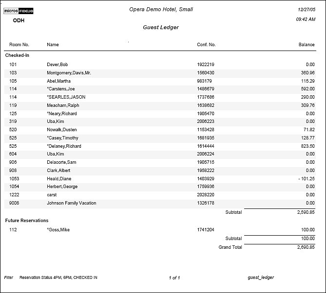 The Guest Ledger Report displays the current balance associated with in-house guests for today. The output includes the guest room numbers and is sorted by guest name. The results of the report are displayed separated by the selected reservation statuses. The Checked-In section displays all checked in reservations, including those that have a zero balance. The Checked Out section displays all checked out reservations with a balance, as well as those that have a zero balance if they are checked out with open folio. All of the other sections only display reservations with a balance greater than zero.