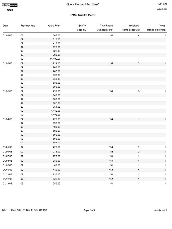 RMS Hurdle Point displays all hurdle points (rates) for a property for a date range specified. The output is based on the activation of a Revenue Management license code. The report can be used by the hotel to check the Hurdle Point by Product Class/Yield Category for up to a year out and also indicates the Sell To Capacity values that have been set for the hotel in addition to providing you with inventory information.