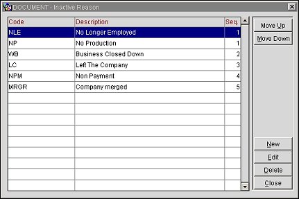 Display Seq. Enter a display sequence number which corresponds with the sequence order in which the inactive reason will display on the Inactive Reason screen. You may also choose to allow the default which is the next sequential entry. For instance if the last entry of inactive reasons is given the sequence number 5, the default for the next sequence number is 6.