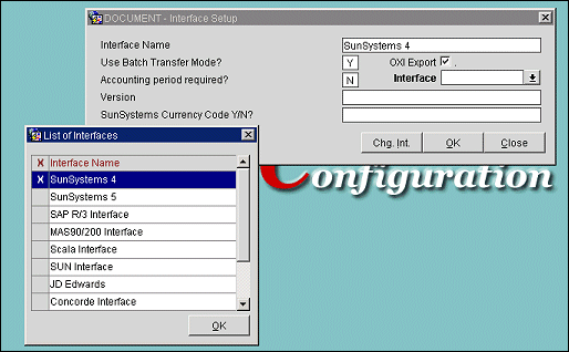 Select Setup > Configuration > External > Back Office > Interface. The Interface option is used to identify the external system to which the program will interface and to determine some basic interface options.