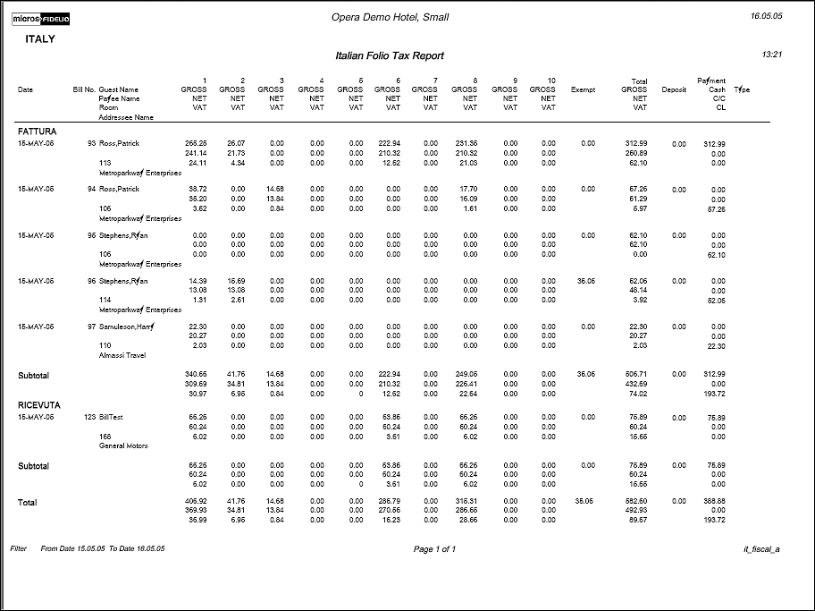 The Italian Folio Tax reports will print statistical information for all bills and is formatted based on the style of the report selected. The report output is grouped by folio types and displays the Net, VAT and Gross revenue for all bills generated in the property. The Countries parameter must be set to IT, for the reports to generate the correct data. As this is a country specific report, it must be manually added to the Report Menu. Only one of the reports has to be actually added to print either report style.