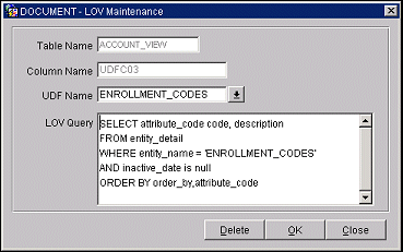 To access the LOV Maintenance screen, select the LOV Setup button from the Data Definition screen. (System Configuration>Setup>Data Definition). Use this screen to attach a previously defined LOV group and its list of values to a UDFC field. OPERA then automatically creates the SQL statement that will call the configured LOV. When this field is added with Screen Painter, the LOV is already attached to the UDFC field. (See Screen Painter Overview.)