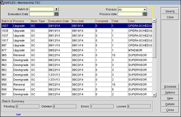 A batch process can be used to downgrade, renew, or upgrade memberships according to membership type. A batch ID is automatically assigned to the processing run if there are memberships that would be affected by the batch run. Select the New button to create a new batch process. The Membership TSC screen opens.