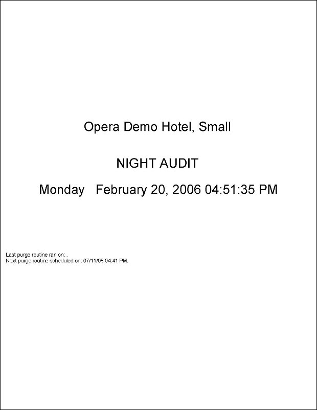 Also displayed is when the last Purge was run and when the next Purge is scheduled to be run. If the OPERA Data Purge is not scheduled, the Weather report in the night audit will display a message stating the Purge is not configured. If the purge has not been successfully run in 48 hours, a message will also be displayed on the report indicating the last date the purge was run.