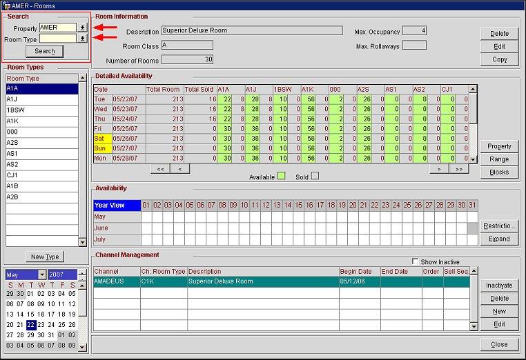The Search area of the Rooms screen allows users to enter search criteria and narrow their results. Select a property in the Property field and a room type in the Room Type field and select the Search button. The various areas and fields are filled-in with the appropriate information.