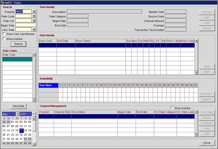 The Rates screen allows users to add, edit, or view rate details , set Property restrictions and distribute and view the Channel Rate distribution. To access the Rates screen, log into OCM and select the Rates menu option.