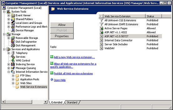 - Verify that the Web Service extension status is Allowed (and not Prohibited). If the status is Prohibited, place your cursor on the ASP .NET v2.0.xxx Web Service extension and select the Allow button.