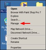 - Right-click on the My Computer icon and select Manage. The Computer Management Window appears.