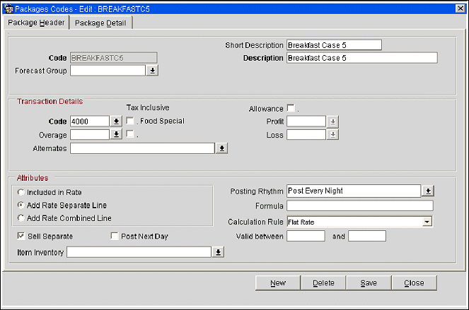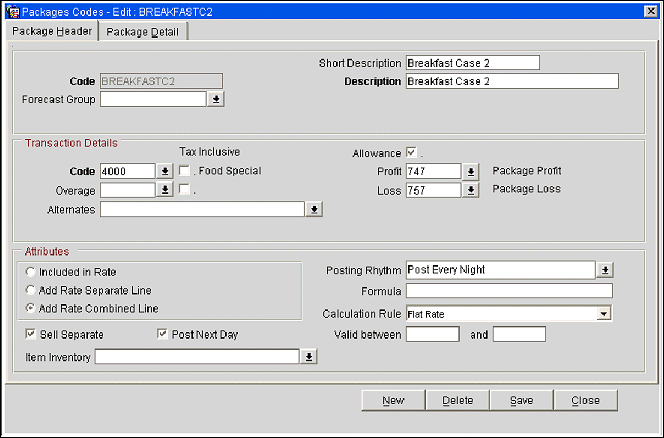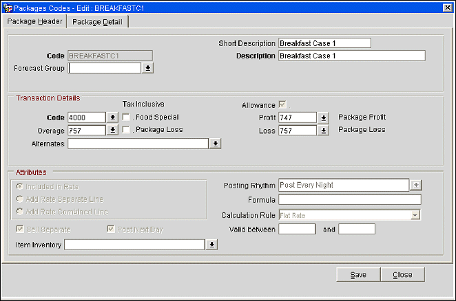 Breakfast package element will be added to the price of the rate code to which it was attached. Allowance will be generated during the end of day process in preparation for consumption the next day. A single line entry will appear on the folio for the rate and package consolidated together.
