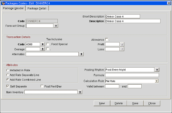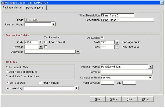 Dinner package element will be posted, but not added to (included in) the rate code to which it was attached. No allowance will be generated and revenues will be posted during the end of day process. In this example irrespective of whether Dinner is taken or not, it will be classified as consumed. Two line entries will appear on the folio for one for the rate amount and another for the separate line package.