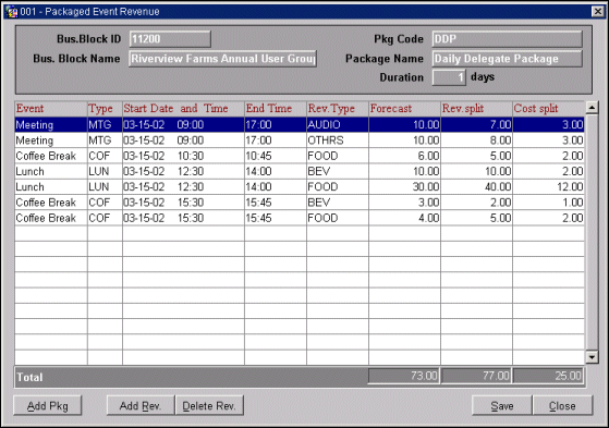 Add Pkg. Open the Select Catering Package screen again in order to allow the selection of additional packages for the current Business Block.