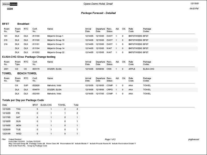Detail. Output will display forecasted consumption by Package Code. The figure displayed will represent the number of Persons, not reservations. This means the report will look at the Quantity of Packages designated on the Reservation, as well as, the configuration of the Package. This will be important in packages that are configured based on the number of Persons.