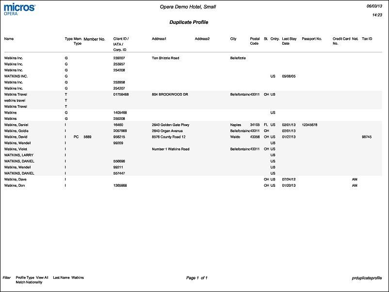 The Duplicate Profile Report displays profile address, membership and passport information to assist in determining if a duplicate profile exists in the OIS system. You may choose to match on like Name  and Address information, or Membership Number, Passport Number with other match criteria. Print this report to track all duplicate profiles so you can either merge them, or purge them from the system.