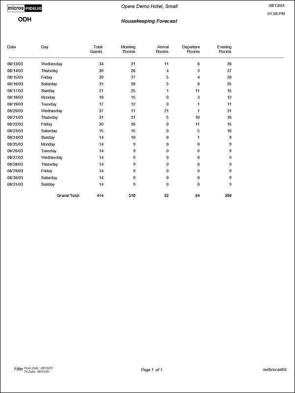 The Housekeeping Forecast Report displays the number of guests who have arrived, departed, or are stay-overs and then the number of Arrival rooms, departure rooms, and the rooms that have been marked for evening service, for a specified day or date range. Print this report for assisting with staffing requirements and tasks.