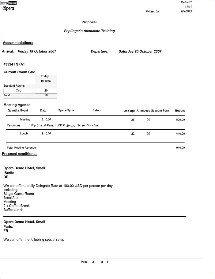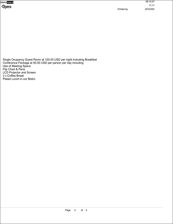 This report presents information similarly to the FIT Contract Merge, in a more scaled down manner. The first page will contain basic contact information for both the sender and recipient along with a section available from free form text useful for faxing the report. The second page contains information according to the selections made on both the Main and Advanced tabs. In this example, you will see the following data: on page 2 and 3 are the Accommodations section that contains the Arrival and Departure date for the lead, the contract number, selected room grid or grids, Meeting Agenda (if one exists) which will display the event, resources and quantity of resources, space type and setup, number of attendees, discount percentage (if one is applied), total budge and total meeting revenue. Next is the Proposal Conditions section which contains the name of the property that can, has or intends to accept the lead and the conditions by which the lead can be accepted. This section can contain multiple entries from different lead properties.