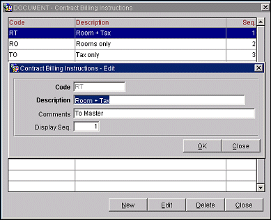 To configure contract billing instructions, select System Configuration> Reservations>Business Blocks>Contract Billing Instructions. The Contract Billing Instructions screen appears.