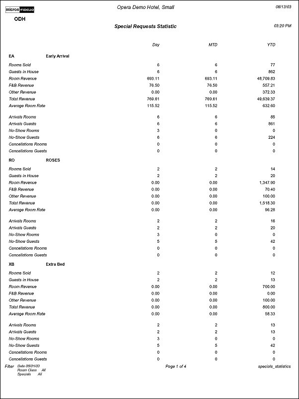 The Special Requests Statistics Report displays daily, month-to-date, and year-to-date statistics per specials code. Details include rooms sold, guests in house, room revenue, F&B revenue, other revenue, total revenue, average room rate, arrival rooms, arrival guests, no-show rooms, no-show guests, cancellation rooms, and cancellation guests.