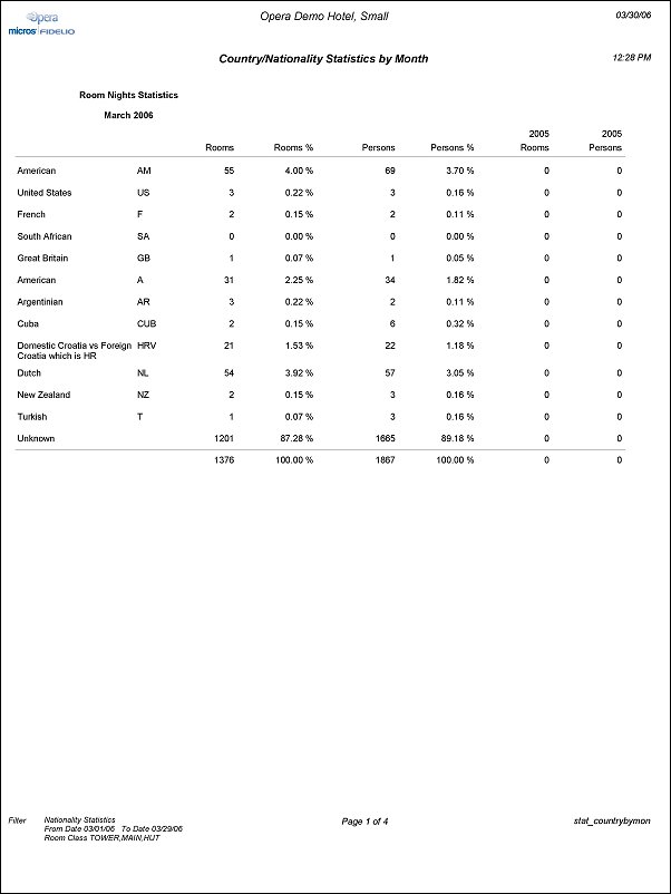 The Nationality/Country Statistics by Month Report allows the properties to generate both nationality and country statistics per month. The statistics output can include Room Nights, Persons, Adults, Children and Tax Statistics if the Application Parameter TAX_FREE_GUEST has been activated.
