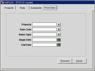 Use the Status Update feature to ensure your GDS/ADS hosts receive configuration changes made in your channels such as  property update, rate update, and availability messages. You can also specify the begin and end dates for rate code availability. Additionally, you can use the Price Sync tab to synchronize rate prices in the internal table system for regional availability functionality.