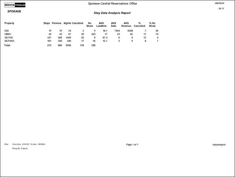 This report displays an analysis of stay data for profiles and/or properties. This report is comprehensive and contains several reports within one, based on the filters and options selected. The user is able to evaluate the stay data by property by Market Code Source Code, Rate Code by Origin Code, Profile Country, Age of Guest, etc. The user can also view stay data based on business generated by a consortium and by profile relationships.