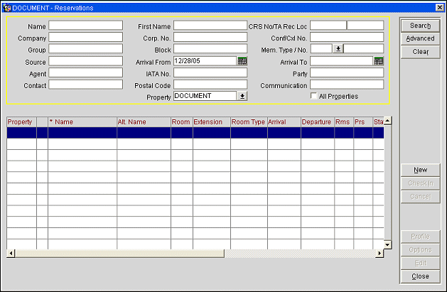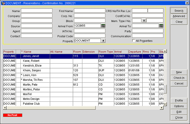 Use this screen to search for the reservation you want to review or update. This screen has a wide variety of search criteria for you to use in locating the reservations you are interested in. (Searching on the guest's confirmation number, if it is handy, is the often the fastest way to locate a specific reservation.) When you select Search, a list of reservations that match your search criteria is displayed in the Reservations search results grid.