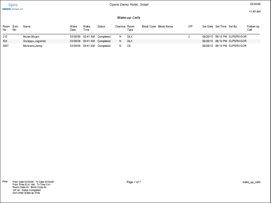 Following is a sample Wake-up Calls Report.